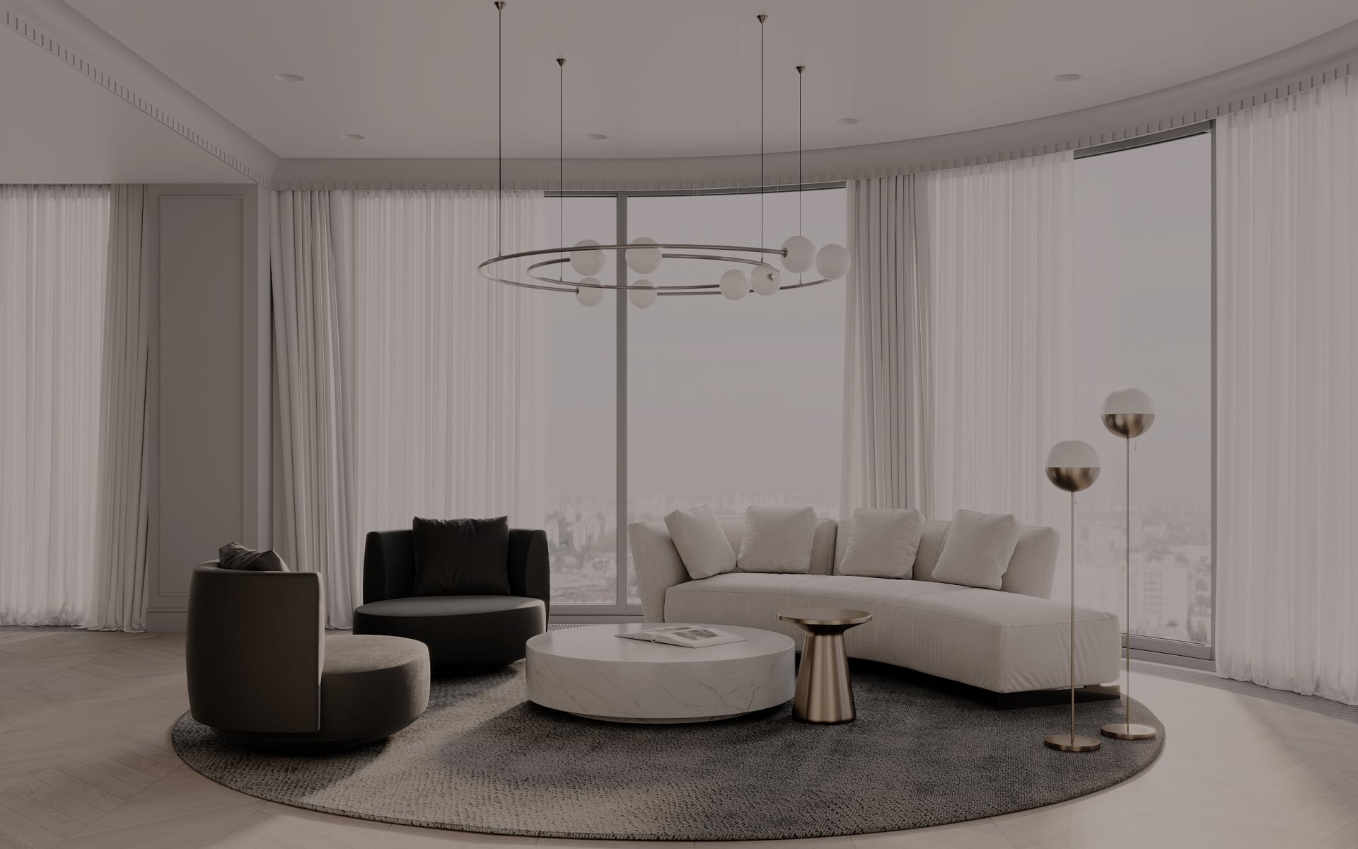 из широких деревянных плит, итальянские межкомнатные двери 2,5 м, итальянские кухни под заказ. Здания остекленные витражными конструкциями, фасады с медью и камнем. Премиум отделка "под ключ" в трех стилях: Нео-классика, Нео-фактура, Нео-деко.